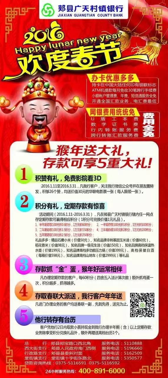 活动期间(2016.1.11-2016.3.31),凡在郏县广天村镇银行辖内任一网点存定期存款可赢得相应积分(1积分可兑款价值1元礼品)。
